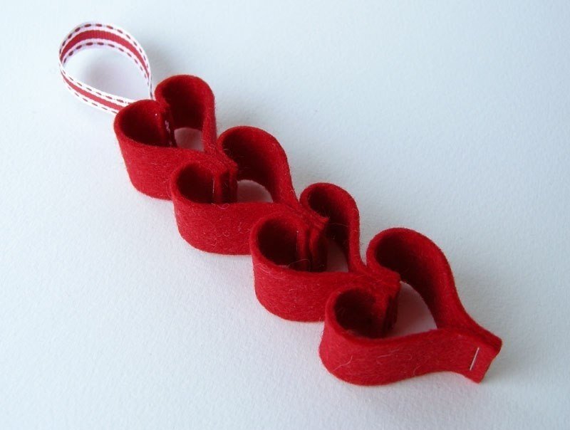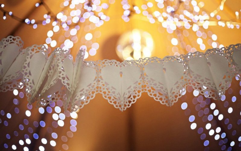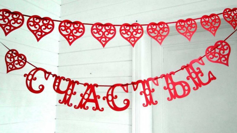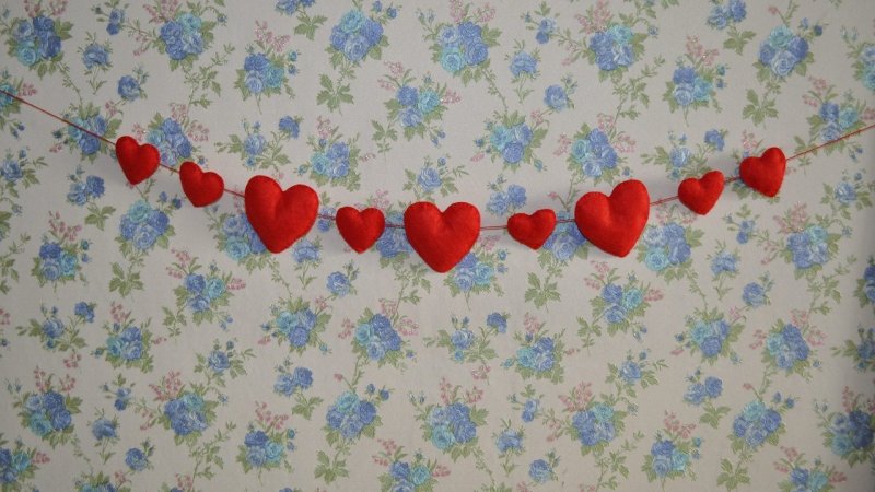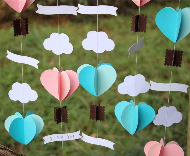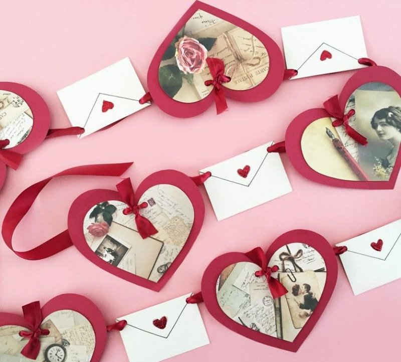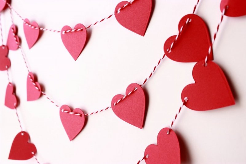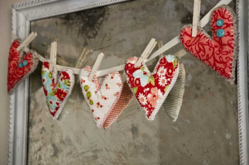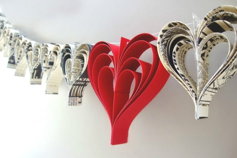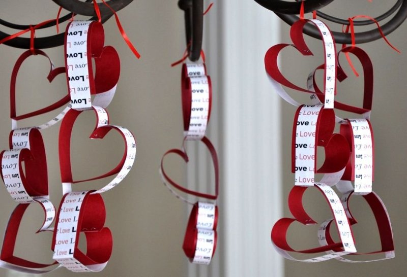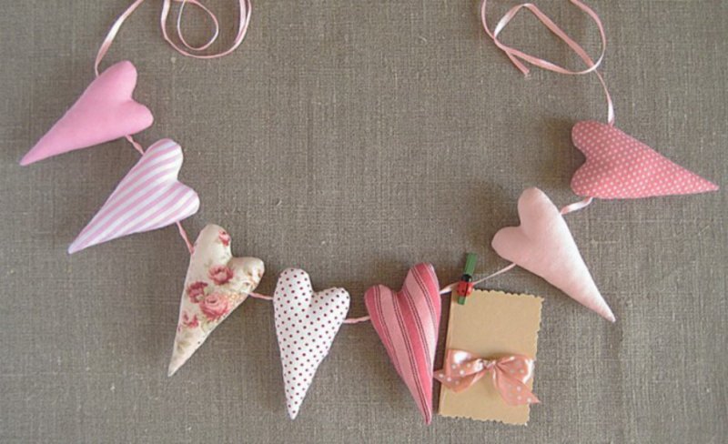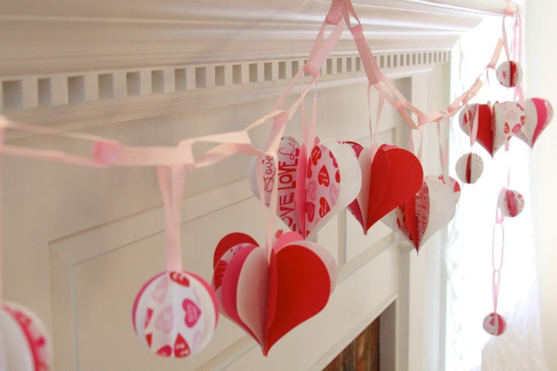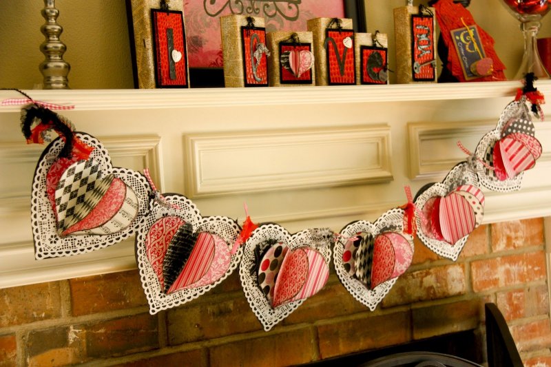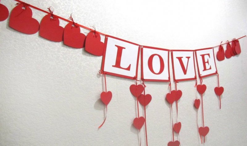 Ко Дню Всех Влюбленных изготавливаются изобилующие сердечками гирлянды в красно-алых тонах. Ими оформляется не только зона, предназначенная для романтического ужина, но и изголовье кровати, вся комната влюбленных. Сердечки выполняются плоскими, с кружевами, объемными, из бумаги, фетра, пластика, оформляются пуговицами, лентами, стразами.