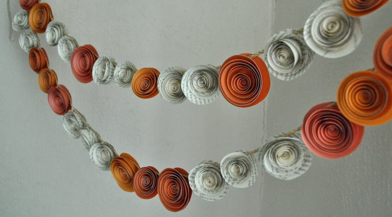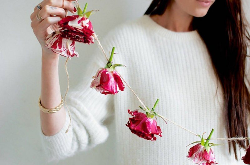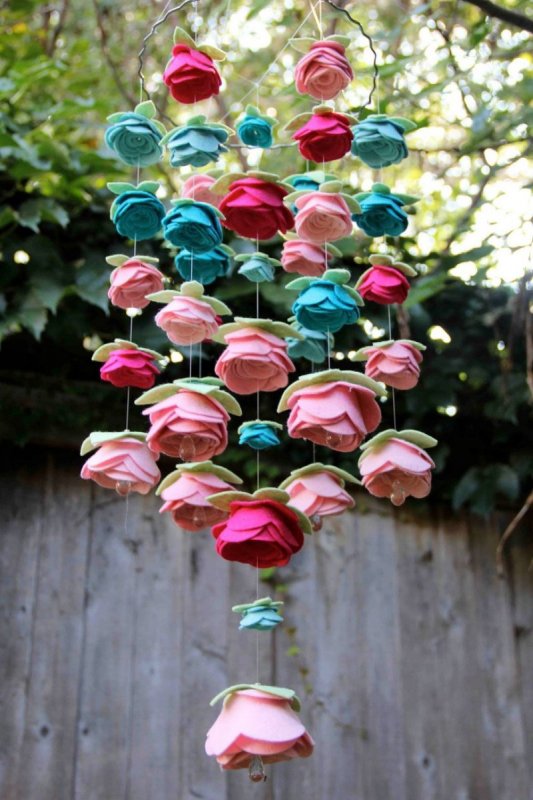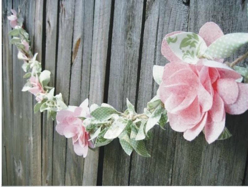 Гирлянда, полностью выполненная из текстильных цветов, способна стать настоящим шедевром. Для ее выполнения потребуются лоскутки несыпучей ткани, нитки, прозрачный клей. Картонные шаблоны лепестков цветка обводятся на текстильном материале, вырезаются по контуру, а их края аккуратно смазываются клеем, чтобы не потеряли форму. После цветок «собирается» в розетку и расправляется. Из ткани зеленого колера вырезаются лепестки, которые также скрепляются между собой. Подготовленные элементы поочередно нанизываются или привязываются на шнурок, готовое изделие подвешивается в запланированном месте.