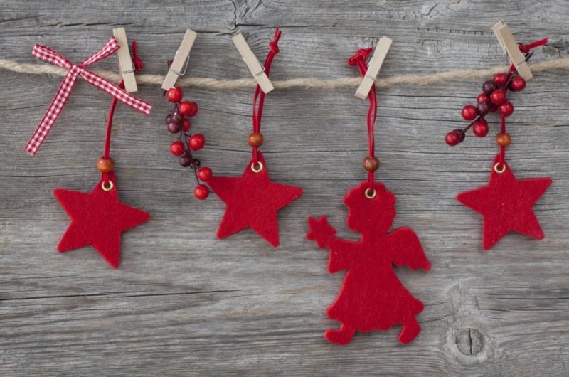 Интересный вариант – рождественские мини-рукавички из красной ткани с окантовкой из белого меха или такого же плана носочки. Растяжку из последних часто подвешивают над электрическим или настоящим камином, если таковой имеется. Вязаные снежинки плетутся из ниток с люрексом, «дождика», подвешиваются на тонкой леске – тогда кажется, что они парят в воздухе.