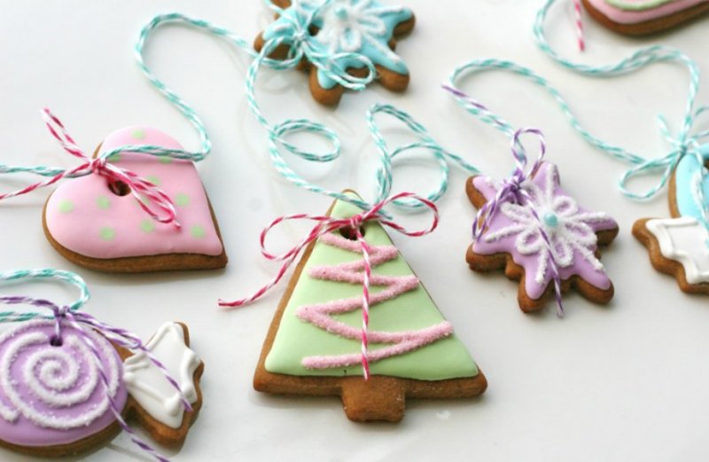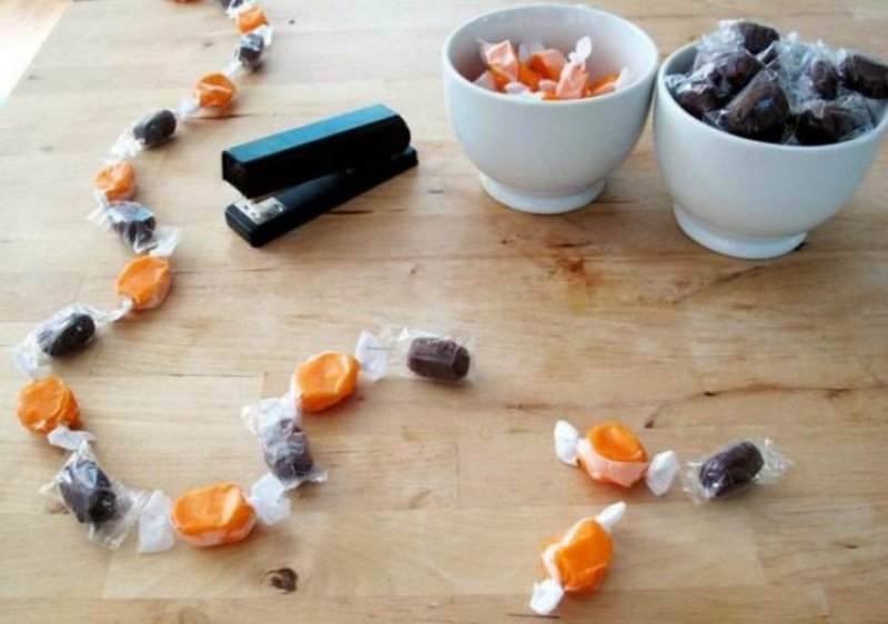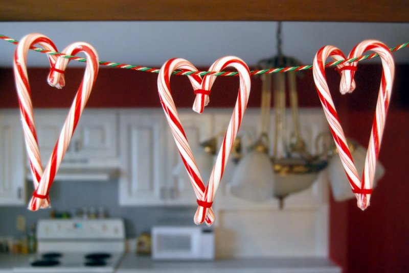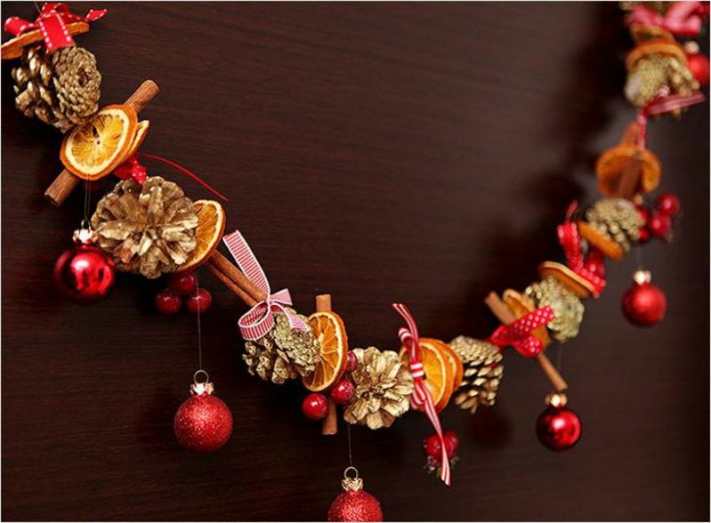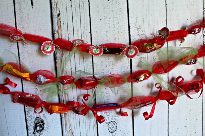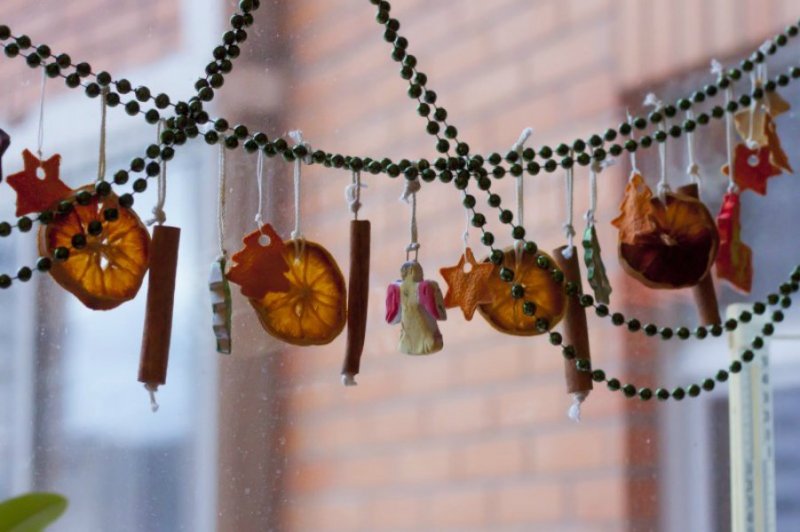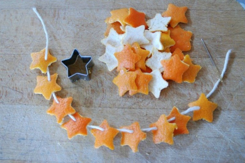 Простая гирлянда из подвешенных на ниточках конфет с разноцветными фантиками не только красивое украшение, но и вкусное. Тонкие высушенные срезы лимонов, апельсинов, перемежающиеся со звездочками из кожуры мандаринов, создадут атмосферу свежести, наполняя комнату своим запахом.
