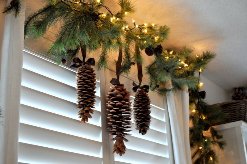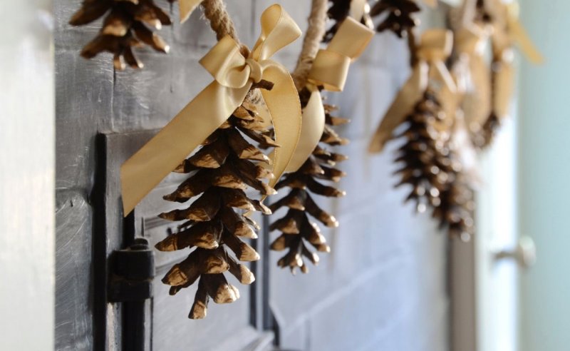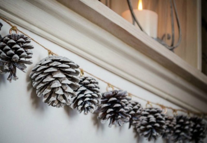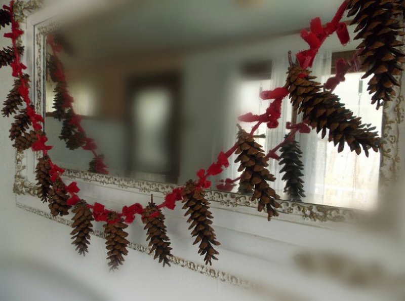 Новогодняя гирлянда выполняется из сосновых шишек, предварительно высушенных, избавленных от семян, частично или полностью покрытых краской из баллончика, посыпанных блестками. Каждая шишечка протыкается шилом, для продевания веревки либо аккуратно привязывается к ней. Работу с краской рекомендуется производить в резиновых перчатках.