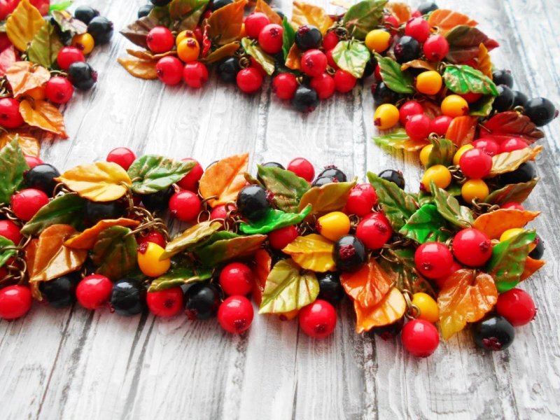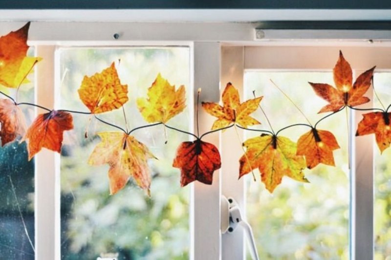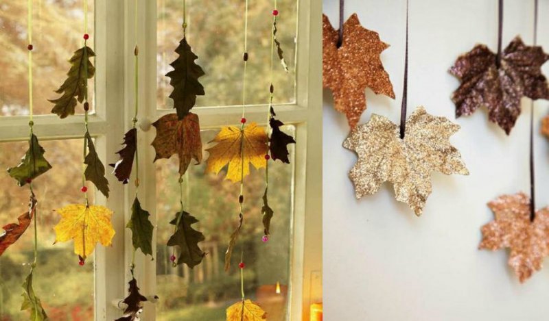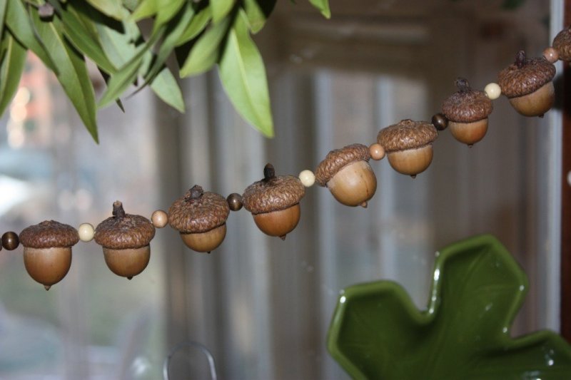 Желуди, каштаны, шишки следует предварительно высушить на открытом воздухе или в духовке, после чего окрасить кисточкой или баллончиком в нужные цвета. Можно сделать им «юбочки» из фольги, гофрированной бумаги. Каждый элемент гирлянды протыкается шилом, в отверстие продевается шнурок.