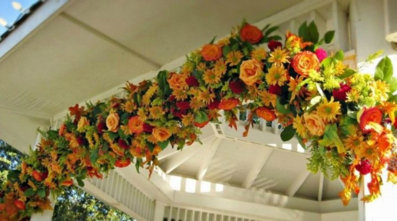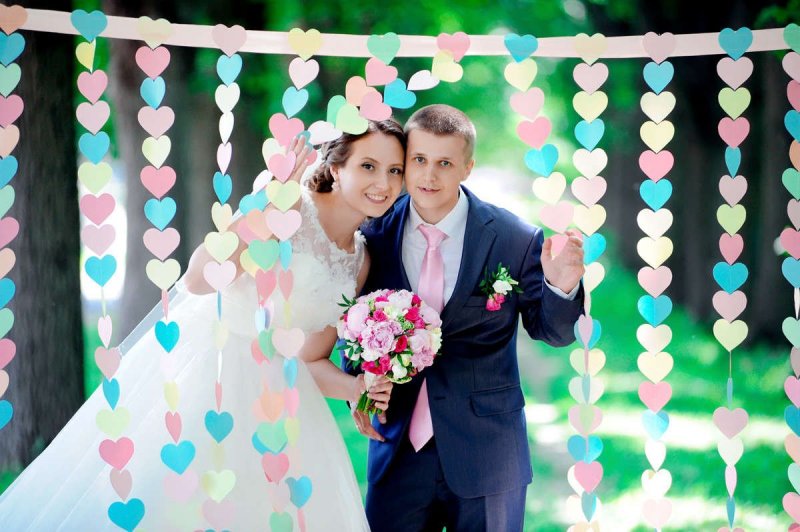Отлично смотрится гирлянда из длинной широкой ленты – ее просто собирают на нитку, прокалывая иголкой посредине, через каждые пять-семь см. Две-три таких детали разного колера можно скрутить между собой – получится пышное, роскошное украшение свадьбы.