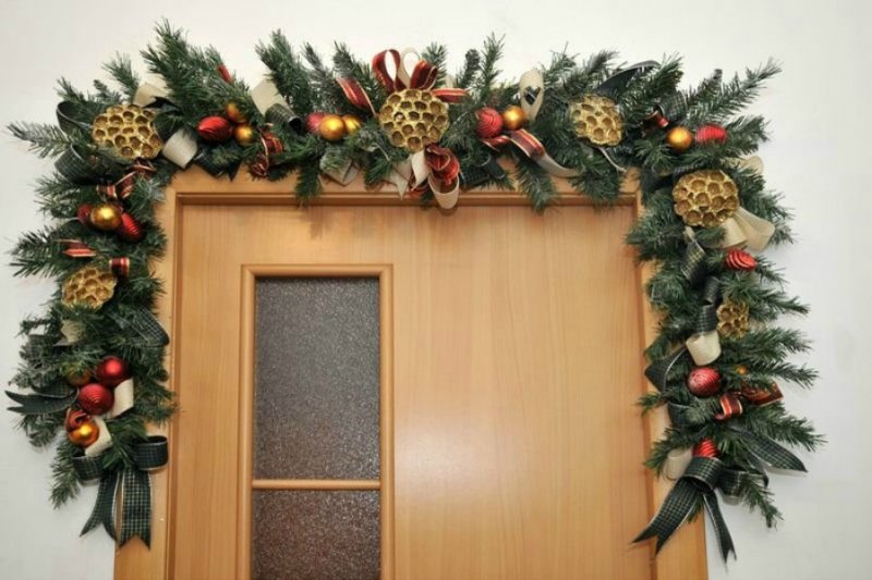 Из готовой длинной гирлянды или нескольких выкладывают праздничный рисунок на стене, шкафу, двери, декоративной ширме.