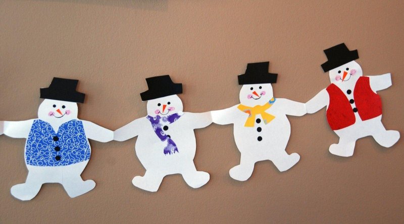 Бумажные звездочки и снежинки могут чередоваться друг с другом, быть разного размера. Для растяжки с Дедами Морозами, елками, снеговиками требуется изготовить трафарет – его рисуют вручную или распечатывают из интернета. «Классическая» новогодняя гирлянда представляет собой ряд треугольных флажков, которые склеиваются из сложенной пополам ромбовидной детали с предварительно вложенной в нее ниткой.