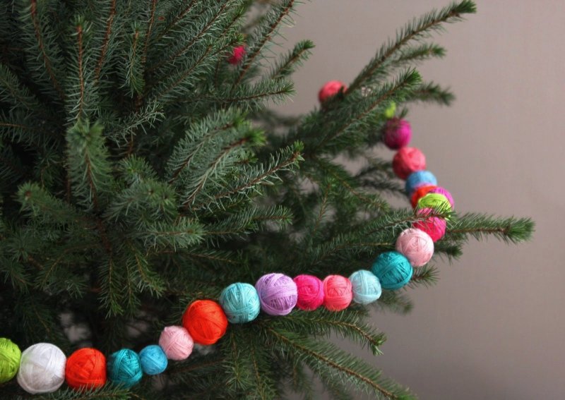 Когда совсем мало времени, а украсить комнату очень хочется, можно просто продеть шнурок в петельки на елочных шариках.
