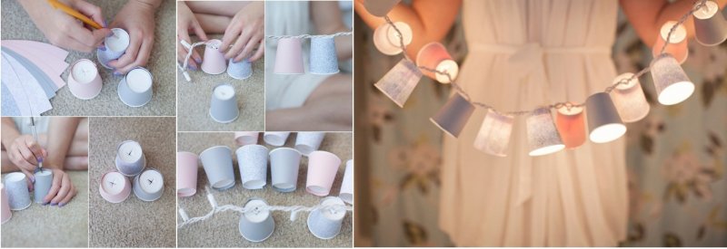 Из картонных, пластиковых стаканчиков от кофе выйдут отличные плафоны для старой электрогирлянды. Для их оформления понадобится бумага, используемая в скрапбукинге, ножницы, клей, скотч. Далее производится вырезание лепестков, волн, иголочек по краю плафончика – их промазывают клеем, посыпают блестками, окрашивают лаком для ногтей. Пластиковые тарелки легко превращаются в подобие футбольных мячей, небесных тел различного цвета, а подсолнухи, другие цветы можно изготовить из стаканчиков, предварительно их разрезав и раскрасив.