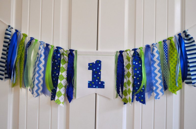 На день рождения ребенка, которому исполняется один годик, гирлянда украшается цифрой «один», для двухлетнего – двойкой и др. Циферку размещают по центру растяжки, ее выполняют из бумаги, ткани либо покупают надувную. Остальную длину шнурка оформляют игрушками от киндер-сюрпризов, привязанными на ниточки, текстильными бабочками, медвежатами, картонными буквами и др.