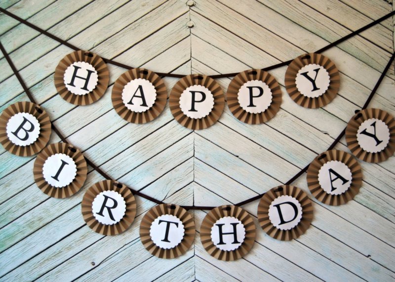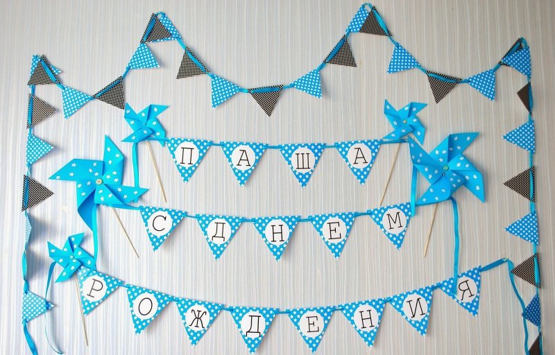 На день рождения взрослого или ребенка выполняется растяжка с фотографиями именинника, перемежающимися с цветными флагами. На флажках можно написать «с днем рождения», а также всевозможные пожелания виновнику торжества. Также желательно использовать символы того, что он любит: музыканту делают гирлянду, имитирующую черно-белые клавиши рояля, фигурки гитар, доктору – со шприцами (можно использовать настоящие, предварительно покрасив их) и листиками-рецептами, с непонятным почерком. Спортсмену подойдет украшение из наград-вымпелов, олимпийских колец, программисту – растяжка из проводов, компьютерных мышек.