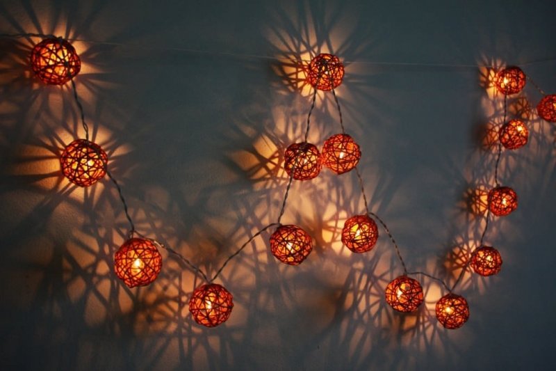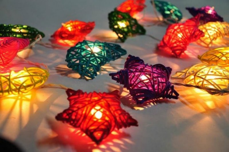 Готовую гирлянду подвешивают на окно, оплетают елку на улице или в доме, украшают периметр комнаты, навес над крыльцом.