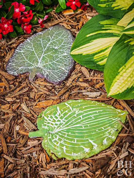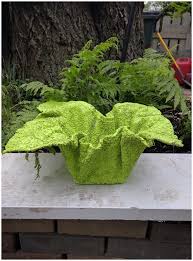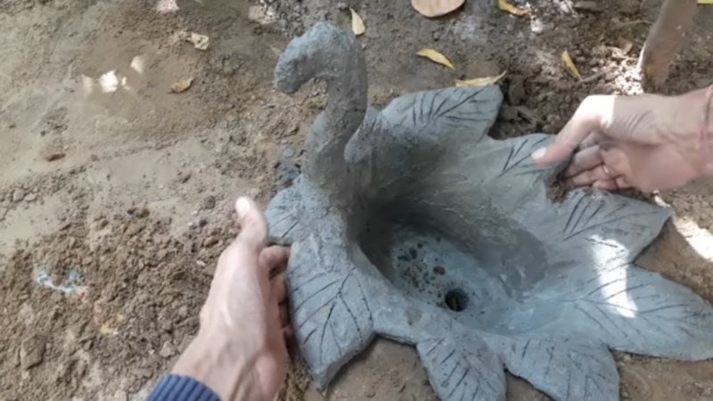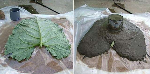 Листья лопуха. Процесс изготовления очень прост. На улице делается насыпь, бугорок из песка. Сверху на него укладывается пленка, на нее лист лопуха, который обмазывается раствором толщиной до 2 см. После чего накрывается полиэтиленом до полного высыхания. Через несколько дней исходник можно удалить, чашу покрасить в зеленый цвет.