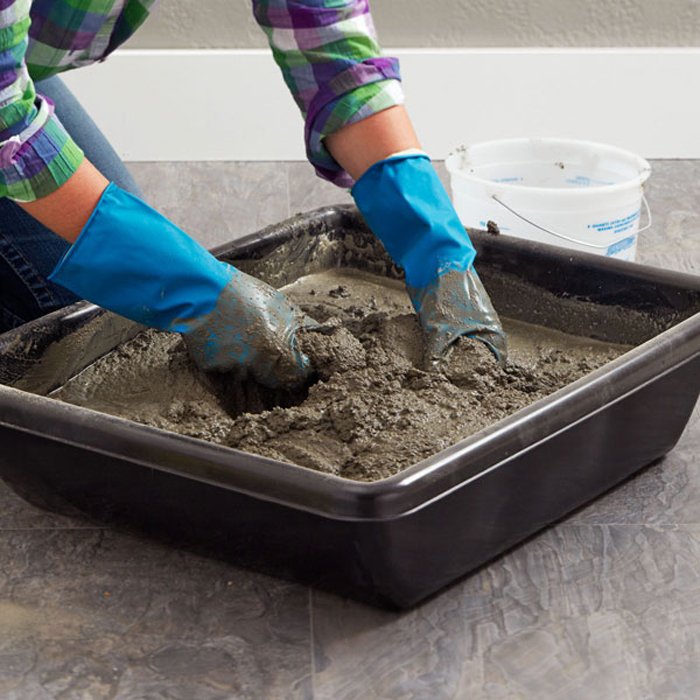 Замешиваем раствор. Если изделие будет иметь сложную структуру, выступы, мелкие элементы, делаем его более пластичным, максимально текучим. Для создания ровных поверхностей доводим консистенцию до более густого состояния, так чтобы полученная масса не растекалась.