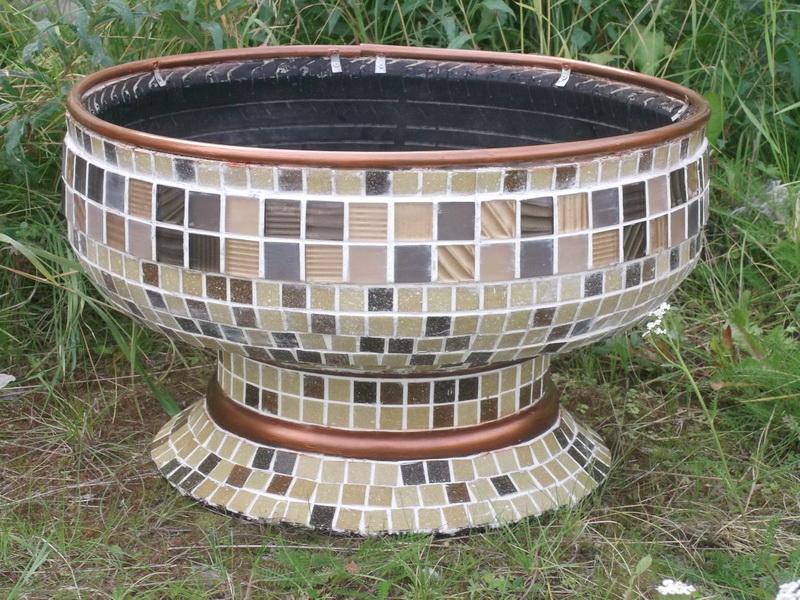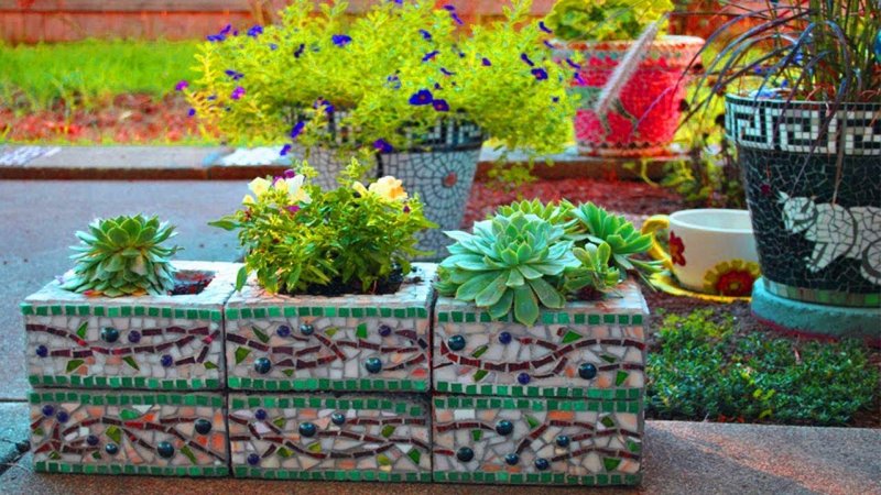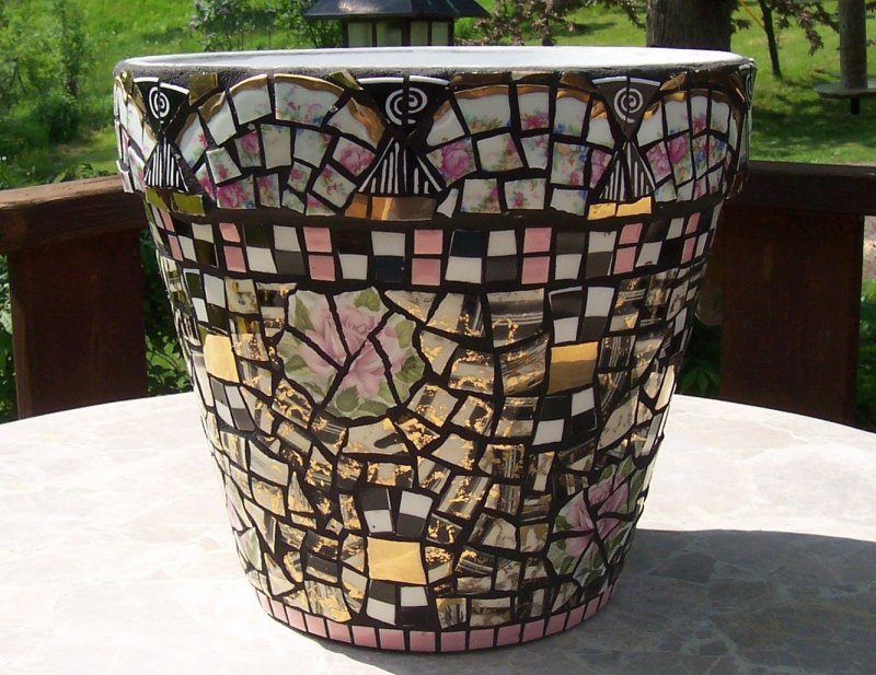 Вазон можно покрасить в белый цвет, тогда он отлично будет смотреться вблизи фонтана или статуи. Чаша, окрашенная в золотистый цвет, вообще подойдет для многих стилей. Хорошим решением для оформления может стать битое стекло, посуда, мозаика. Интересно выглядят поверхности с выдавленной текстурой природных листьев.