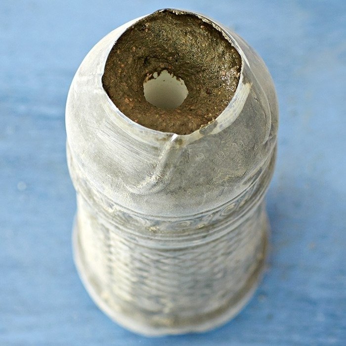 Берем бутыль из пластика объемом 6 литров. Срезаем боковую поверхность. В крышке проделываем отверстие. Металлическому прутку диаметром 8 мм, длиной до одного метра придаем характерную форму. Вставляем в отверстие и фиксируем его в горлышке при помощи битого кирпича и плиточного клея. Пучок меньших по диаметру проволок заводим в дно. Бутылку внутри заполняем песком до краев, чтобы при нанесении смеси стенки не деформировались.