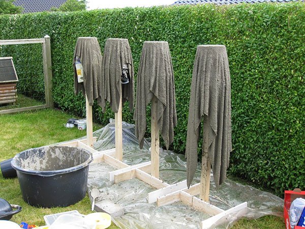 Модели, выполненные из текстильного полотна, смотрятся оригинально, при этом делать их очень просто. Для работы потребуется ткань и ведро. Процесс займет немного времени. Сначала замешивается раствор, в него опускается полотенце или мешок, находится там до момента полной пропитки. Затем вывешивается на ведро или таз, зафиксированный на опоре. После того, как смесь немного застынет, формируются края будущей садовой чаши. Их можно подрезать, подогнуть.