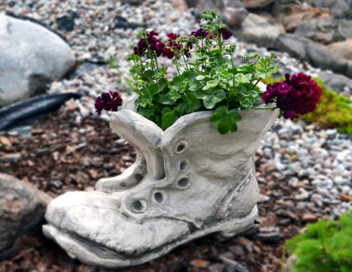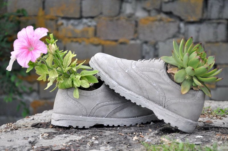 Ботинок. Из старого башмака, замоченного в бетонном составе, можно соорудить самодостаточную клумбу, которая не нуждается в дополнительной отделке.