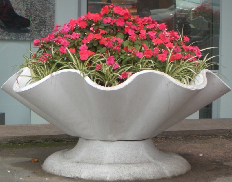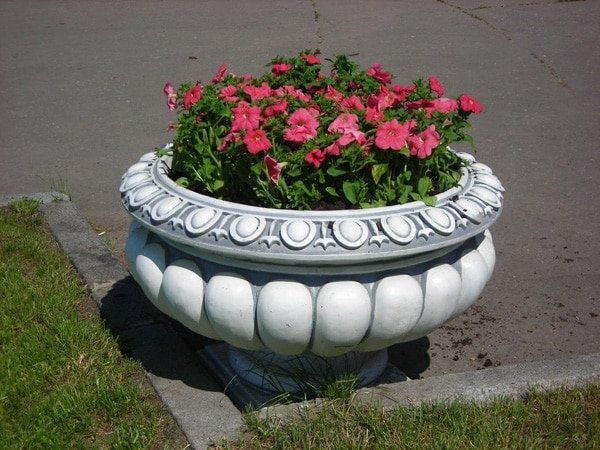 Бетонный раствор характеризуется своей пластичностью, поэтому вазе можно придать практически любую форму. Главное – конструкция должна сочетаться с общим стилем участка, например: