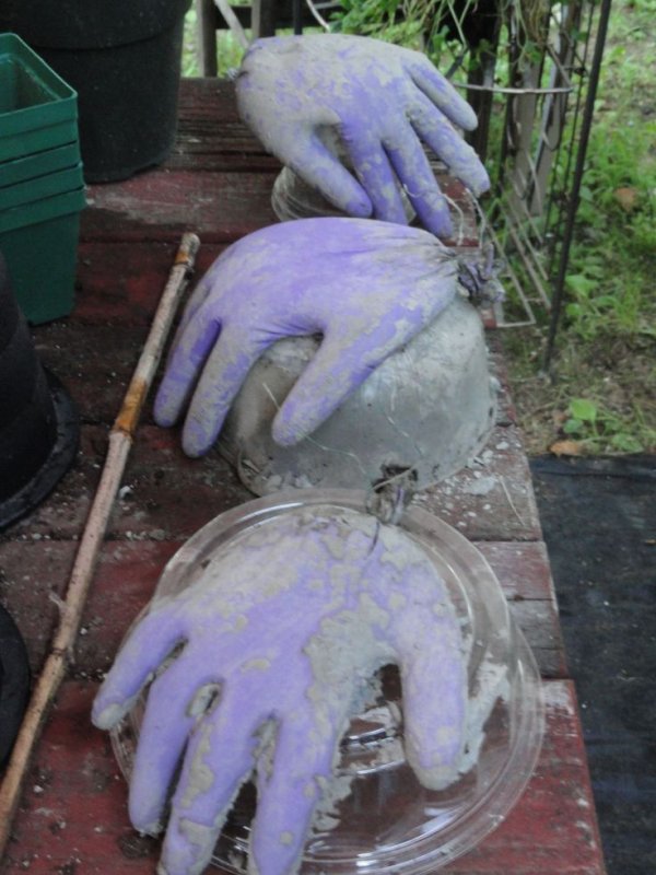 Имитация рук. Такую конструкцию можно сделать из пары резиновых перчаток. Для этого их достаточно заполнить раствором и высушить. После чего перчатки удаляются. При желании горшочек окрашивается.