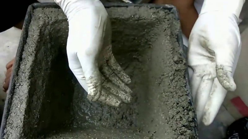 Чтобы проверить качество бетона, достаточно полученную массу сжать в руке. Если при этом выступает вода, смесь разбавляется песком, в рыхлую структуру домешивается жидкость.