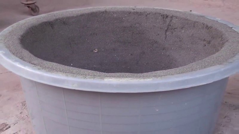 Заливаем часть смеси на дно емкости более крупного размера. В зависимости от величины конструкции формируем толщину слоя. Для небольших чаш достаточно 3 см.