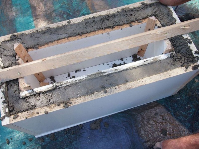 Заливаем состав в промежуток между стенками форм. Для удаления воздуха необходимо проткнуть смесь палочкой или арматурой.