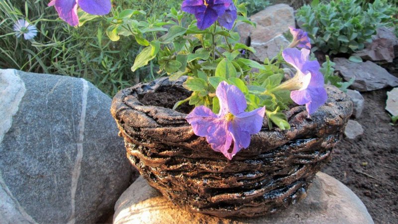 Корзина. Рецепт приготовления элементарен. В качестве каркаса может использоваться само плетеное изделие. Достаточно его пропитать цементной смесью и покрасить краской. Такой вазон выглядит нежно.