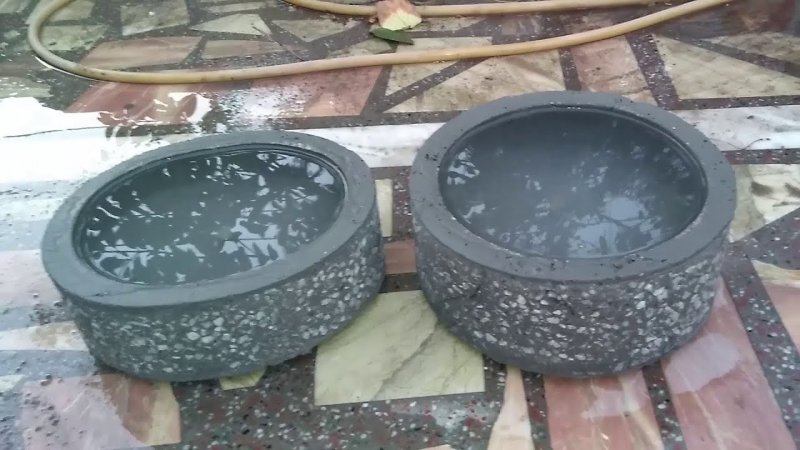 Элементарный способ создания цветочной вазы. Для работы потребуются две разные по объему емкости. На дно большей по диаметру тары заливается раствор, выравнивается. Далее в нем формируются дренажные отверстия. Наполненная песком или другим грузом меньшая емкость устанавливается внутрь по центру. Промежуток между стенками заполняется смесью. После суточного высыхания шаблоны удаляются. От формы поверхности используемой тары будет зависеть внешний вид вазона. Он может иметь рисунок в виде полос, выпуклые места.