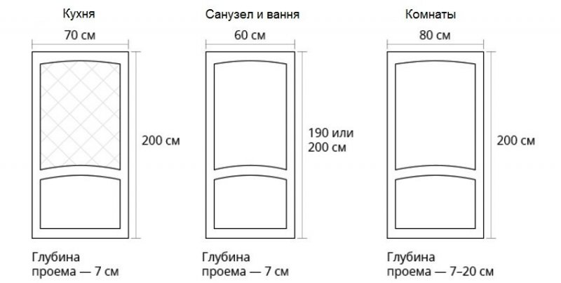 Требуемые по государственным стандартам параметры строго регламентированы. Высота проема — 2060/2090, 2160/2190 либо 2260/2290, ширина — 630/650, 680/700, 780/800, 880/900, 980/1000. Ширина проема для двустворчатого изделия — 1280/1300, 1480/1500, 1580/1600. Стандартная глубина межкомнатного проема 7 см для помещений санузла, кухни, от 7 до 20 – для жилых комнат. Снизу, между полотном и полом, необходимо оставлять зазор: под кухонной дверью – 15-19 мм, под всеми остальными – 4-12 мм, сверху – 3-4 мм.