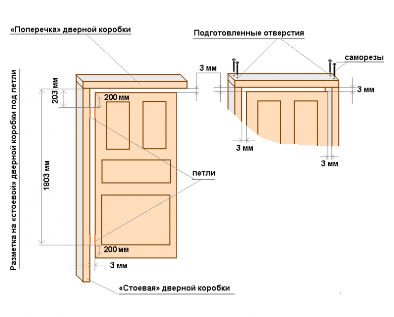 Дверная коробка выполняется соразмерной полотну, превышая его параметры в определенных пределах. Коробка обычно продается в комплекте с дверью, образуя дверной блок. Величина зазоров между полотном и коробкой составляет по 3-4 мм с каждой стороны. Это расстояние необходимо для легкого закрывания-открывания, крепления на петли.