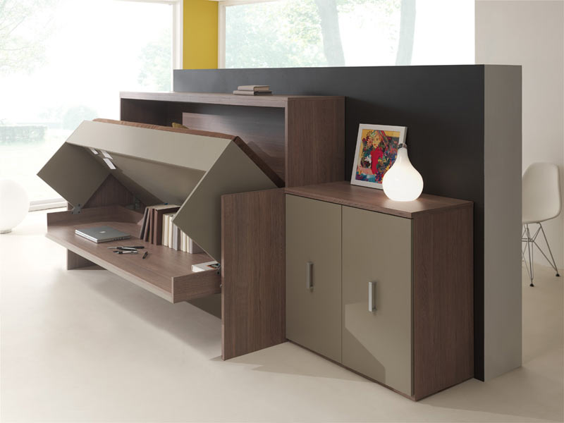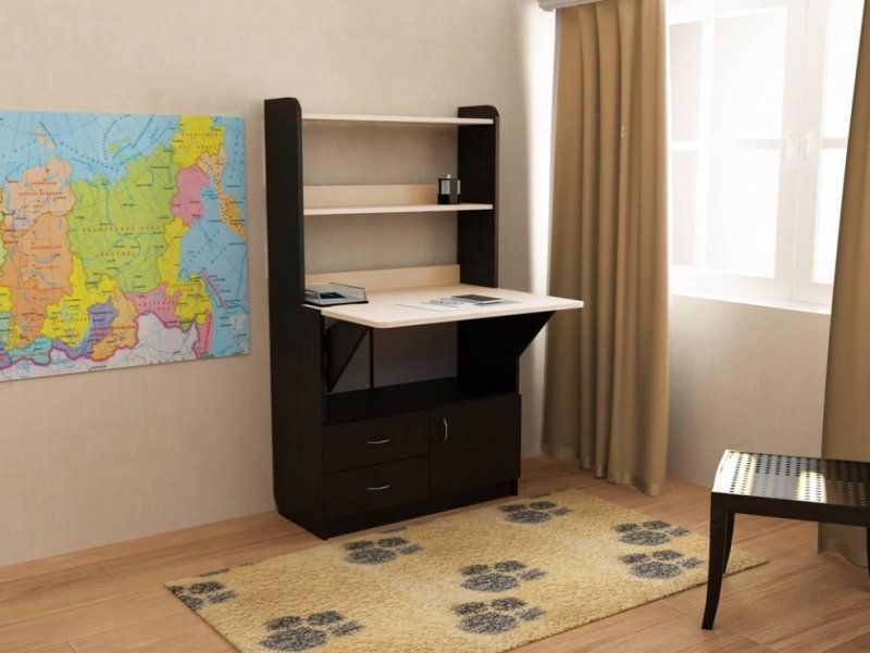 Полка, при взгляде сбоку имеющая вид треугольника, оборудуется откидной плоскостью в нижней части, которая служит компактным письменным либо компьютерным столиком. Шкаф-стенка, оформленная в одной части откидывающимся диваном либо кроватью, в другой – полноценным столом, имеет всевозможные полки, выдвижные ящики и часто является единственной мебелью миниатюрной квартиры-студии.