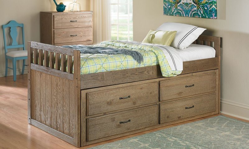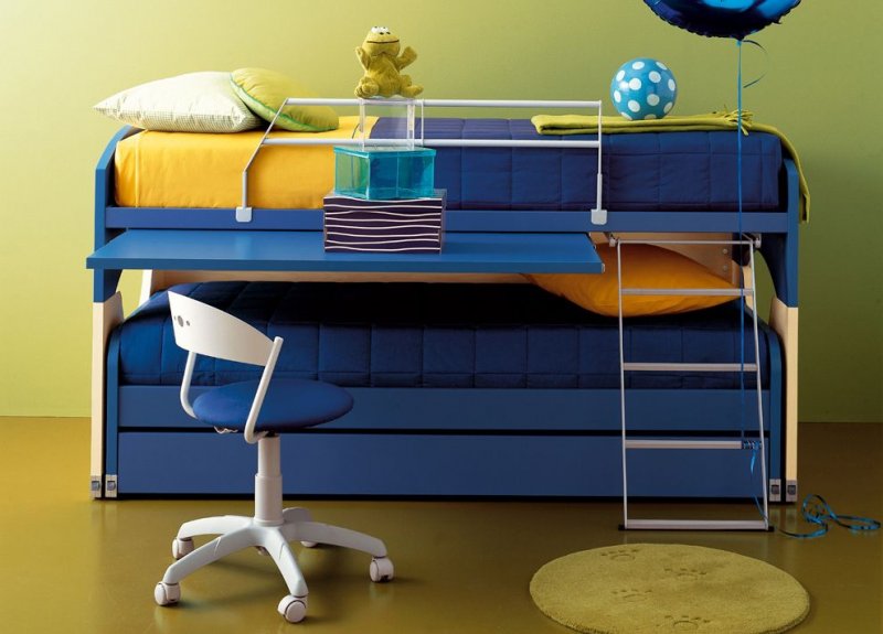 кровать для двоих детей. Одна из спальных плоскостей расположена сверху, а под ним – вторая, замаскированная под широкий выдвижной ящик. Компактные места для хранения обустраиваются в самом низу;