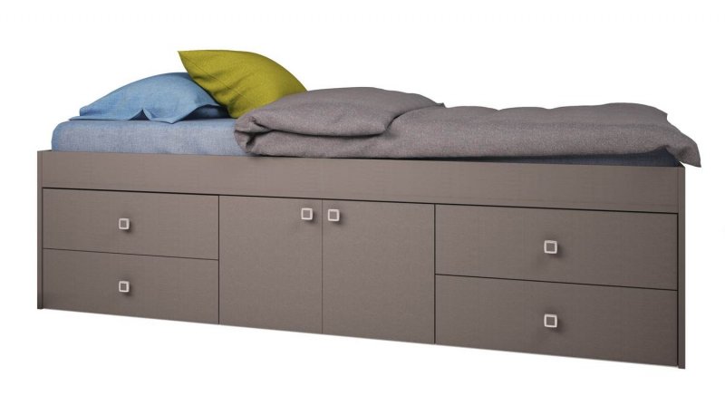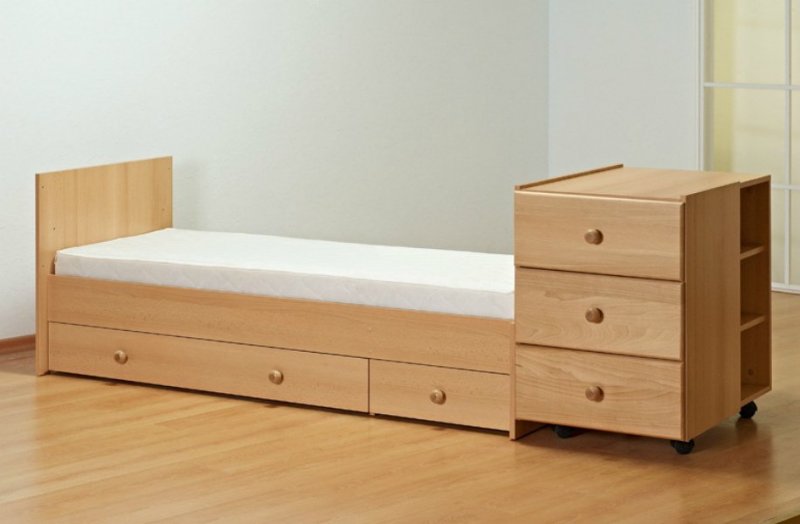 Комод – изделие с несколькими выдвигающимися ящиками. Конструкция, совмещенная с кроватью, обычно делается немного выше стандартной, вмещая под поверхностью для сна один-три ящика для постельного и других вещей. Комод-кровать для детской выполняется в трех вариантах: