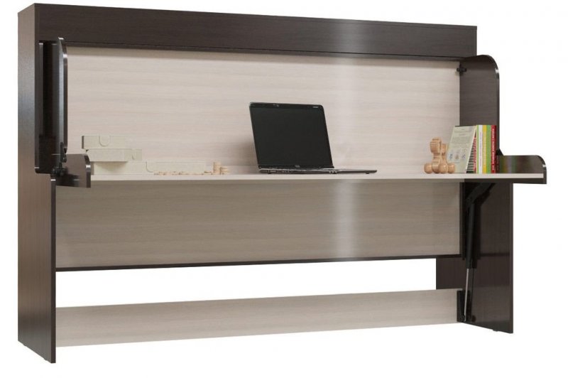 спальное место откидывается к стене, скрываясь под полкой. Планка, играющая роль «ножки», на которую опирается кровать в разложенном виде, становится узким столом;