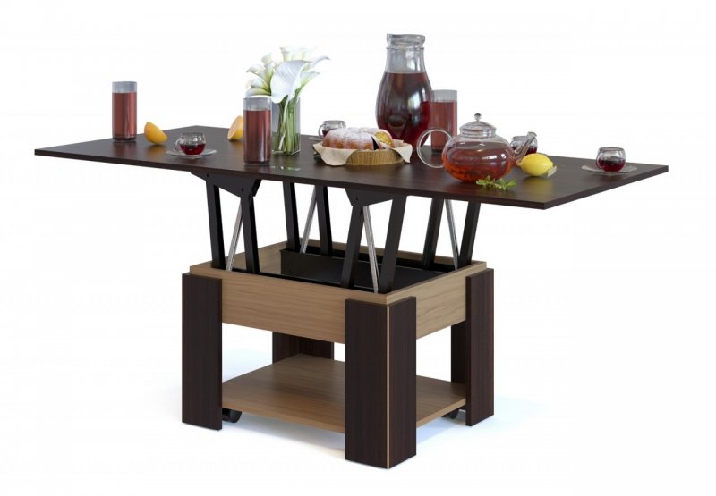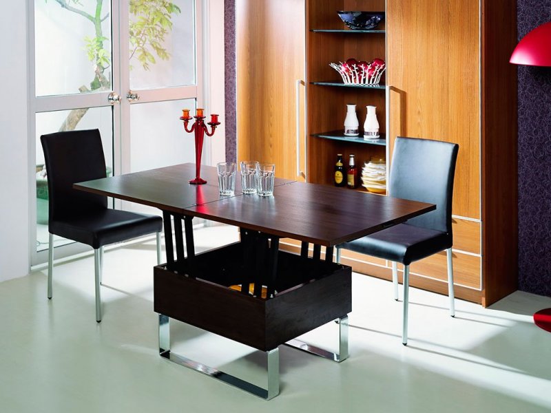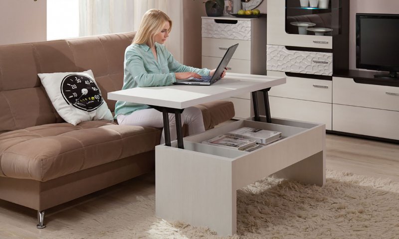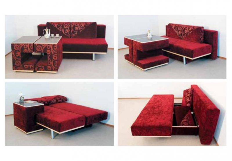 Интереснейший вариант – журнальный столик, преобразуемый из сервировочного. Небольшой трансформируемый шкаф-купе легко становится компьютерным, одновременно являясь местом для хранения домашней утвари, гардеробной. В угловом купе нередко оборудуется мини-кабинет. Диван-стенка имеет высокую спинку, при необходимости преобразуемую в полноценную спальную плоскость для двух человек, обычно имеет несколько полочек, также видоизменяемых. Складной кухонный диванчик прячет в одном из подлокотников мини-бар, в другом – секции для посудных принадлежностей, столового белья.
