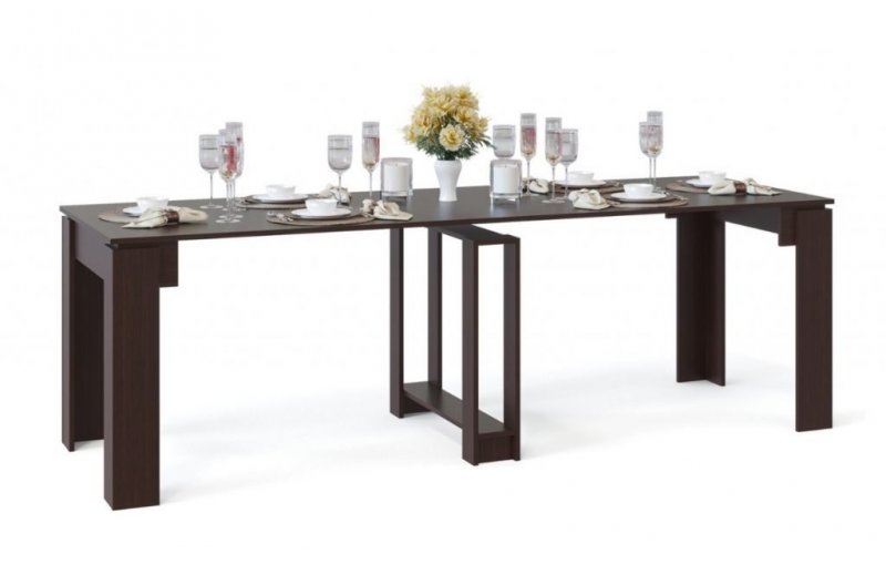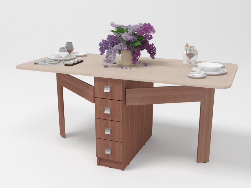 Изделие предназначено для приема пищи – когда стол разложен, за ним легко разместятся от двух до восьми человек. Столешница предмета преобразуется из маленькой в большую, увеличиваясь при этом в несколько раз. Высоту конструкции изменить в большинстве случаев невозможно.