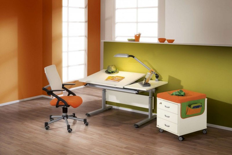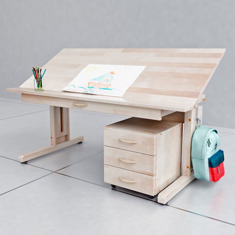Письменный стол-парта обычно приобретается для школьника. Конструкция способна изменять в широких пределах не только высоту, но и угол наклона столешницы. Его легко сложить до размеров компактной тумбочки, чтобы в свободное от выполнения уроков время освободить место в детской для игр, спортивных занятий.