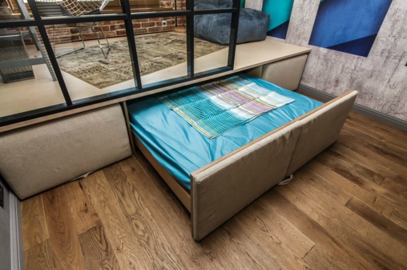 Такое сооружение на ночь становится полноценной плоскостью для комфортного сна двух и даже трех человек, днем складывается, превращаясь в мягкую мебель для сидения. Выдвижные секции для хранения, открытые, закрытые полки обычно располагаются по бокам изделия.