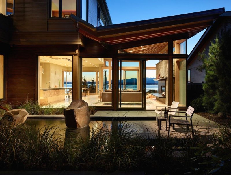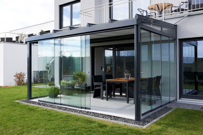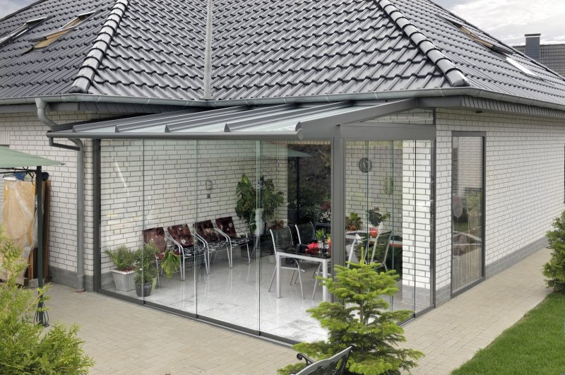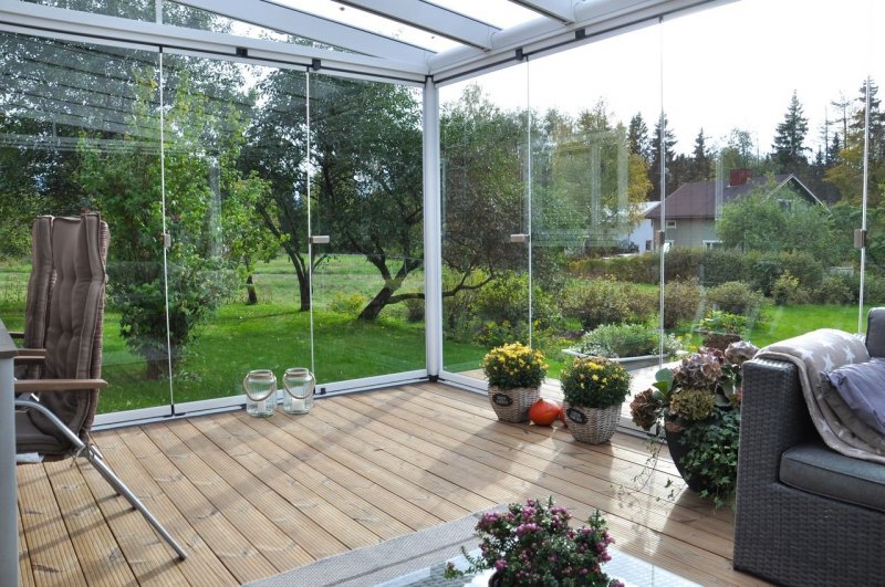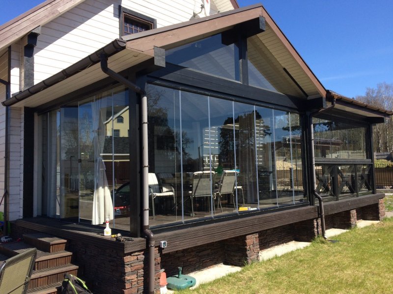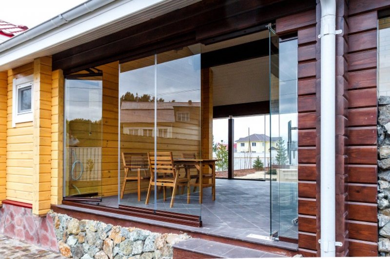 Остекление с рамами — популярный и уже довольно избитый вариант. Листы стекла помещаются внутрь специального каркаса, который обеспечивает конструкции прочность и устойчивость. Сравнительно недавно (всего пару десятков лет назад) к нам пришла мода на безрамное остекление, когда фасад полностью состоит из листов сверхпрочного стекла, которые на стыках уплотняются. Создается иллюзия полностью открытого пространства. Листы стекла закрепляются алюминиевыми профилями у пола и потолка. Этот вариант нельзя назвать бюджетным, зато отдых на такой веранде действительно будет «захватывать дух». Уместно использование безрамного остекления только в тех случаях, когда из помещения открывается красивый вид (на сад, поле, луг, близлежащую реку или морское побережье). Хотя внешне конструкция выглядит хрупкой, на самом деле она даст фору любому другому стеклопакету по прочности. Для безрамного остекления используется только закаленное стекло, которое практически нереально разбить.