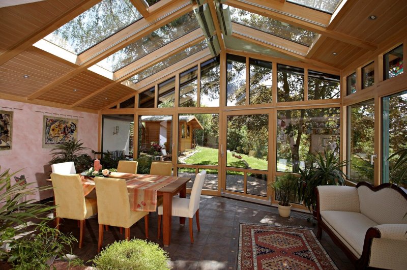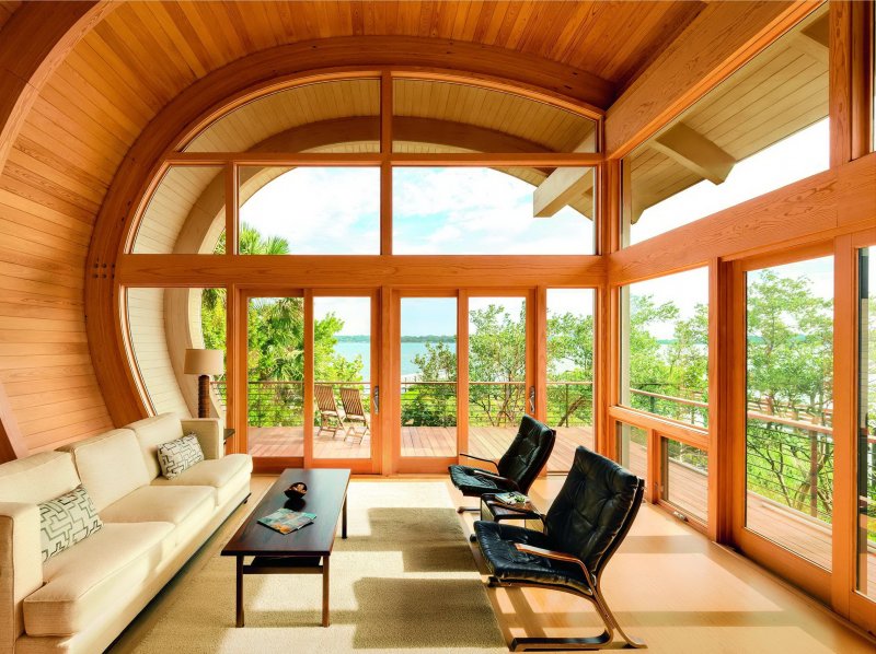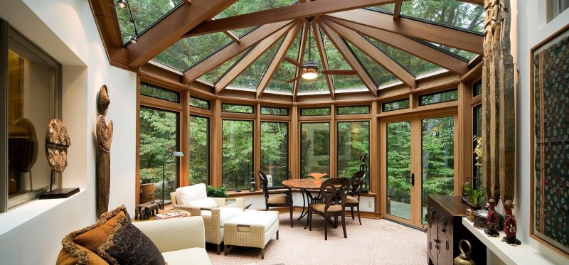 Раньше для остекления домов (не только веранд) использовалась исключительно древесина. С появлением альтернативных вариантов об этом материале стали потихоньку забывать, но его достоинства от этого не померкли. Дерево обладает высокой шумо- и теплоизоляцией. Хотя, конечно, основной «удар» по сохранению тепла получает само стекло, от рам тоже многое зависит. В отличие от пластика или алюминия, древесине не нужны дополнительные термо-вкладыши, так как материал сам препятствует попаданию в помещение холода и выходу теплого воздуха наружу. В древесине имеются микропоры, что позволяет ей «дышать». Производители пластиковых стеклопакетов в характеристиках озвучивают предельный минус для материала в 30 градусов мороза. При этой температуре ПВХ теряет прочность и становится ломким.