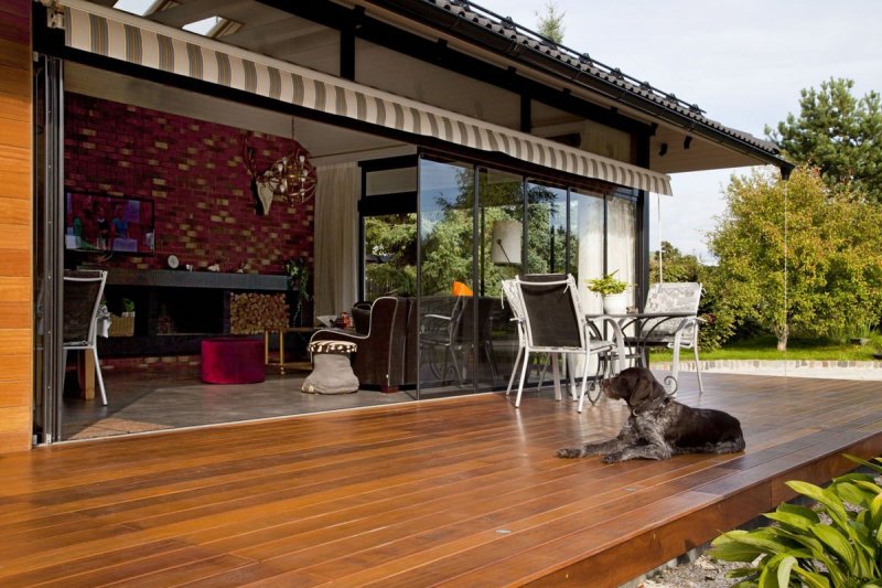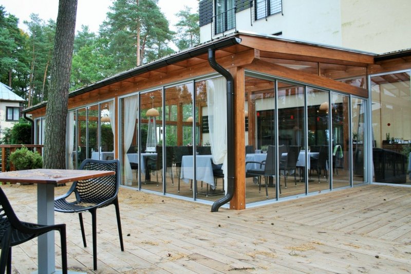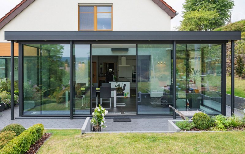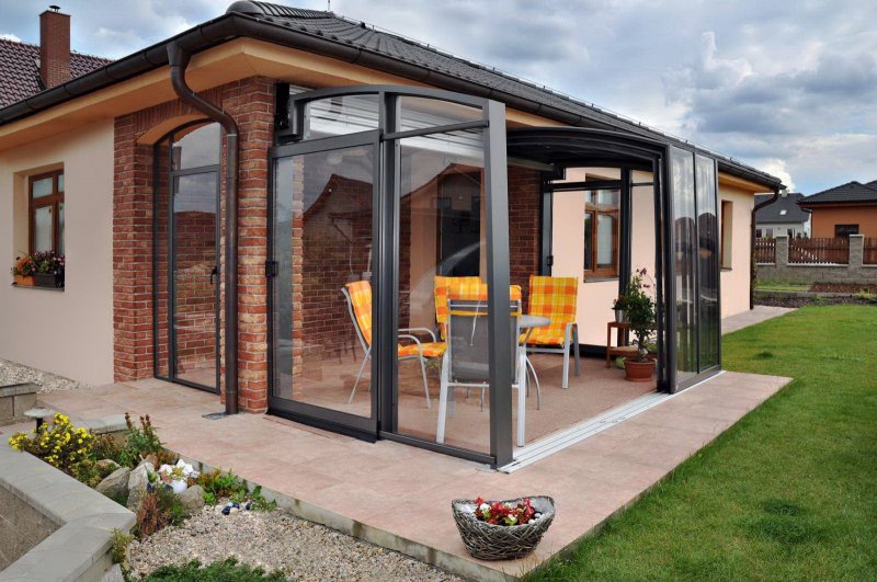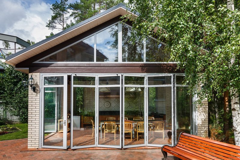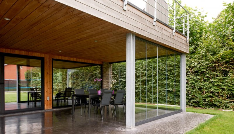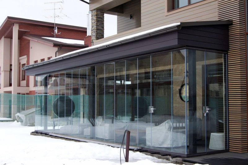 В последнем случае речь идет о панорамном остеклении с рамами, когда большие «окна-двери» компактно собираются у одной из стен веранды. Раздвижные системы не могут обеспечить полную герметичность, поэтому используются только для холодного остекления.