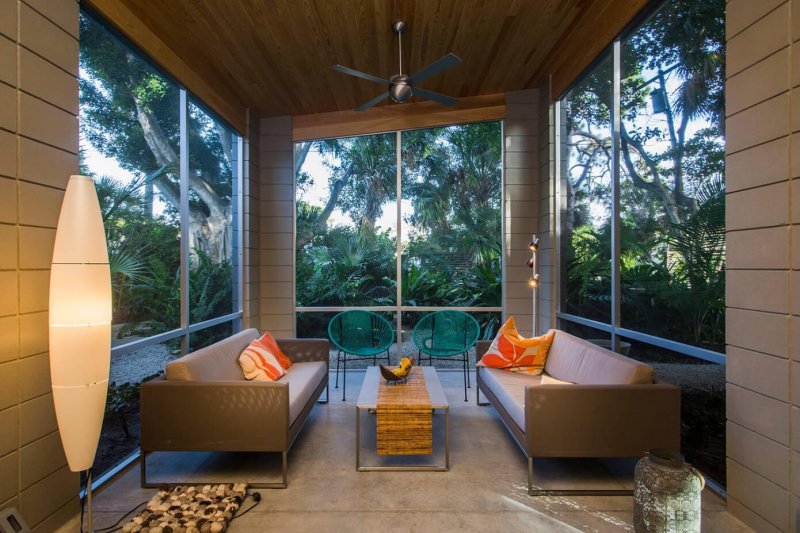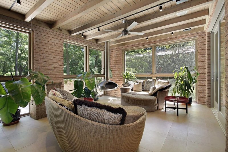 Дизайн веранды подбирают под стилистическое оформление дома. Интерьер этого помещения не должен выбиваться из общей композиции. Чаще всего веранды используются в качестве комнаты для отдыха. Здесь ставят широкий диван, кресла, кофейный столик. Стены снаружи увивают хмелем, виноградом или плющом, а окна завешивают легкими шторами. Когда габариты помещения позволяют, то его интерьер дополняют парой стеллажей с книгами и уютным камином. Если в качестве основного направления выбран лофт, то в отделке превалирует кирпич, а остекление лучше выбирать с алюминиевыми профилями. Аналогичные конструкции подходят к хай теку и современному стилю. Провансу, модерну, классике, шале, ряду этнических стилей больше импонирует древесина. Пластик универсален и может комбинироваться с любыми современными стилями, но он не подходит к элитным апартаментам, где каждый элемент интерьера должен ассоциироваться с роскошью.