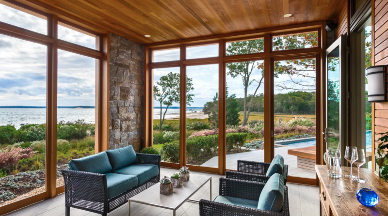 Панорамное остекление выполняется по всему фасаду, то есть окна занимают все пространство от потолка и до пола. Это стильное, оригинальное решение, которое берет начало в европейских традициях оформления окон, выходящих в сад. С веранды будет открываться роскошный вид на близлежащие красоты. Панорамное остекление может быть безрамным и с рамами. Вариант пользуется популярностью не только для веранд, но и при остеклении балконов и лоджий в многоэтажках с небольшим отличием: там система обязательно дополняется защитным каркасом, который предотвращает падение человека на стекло.