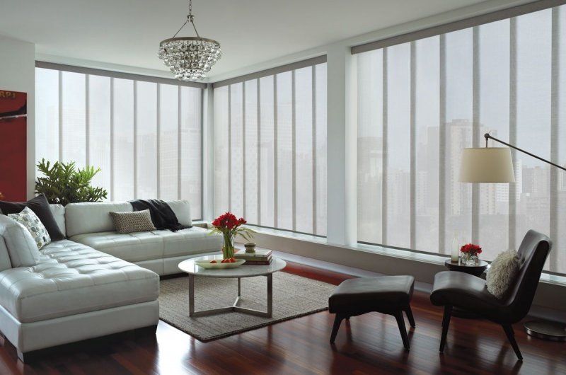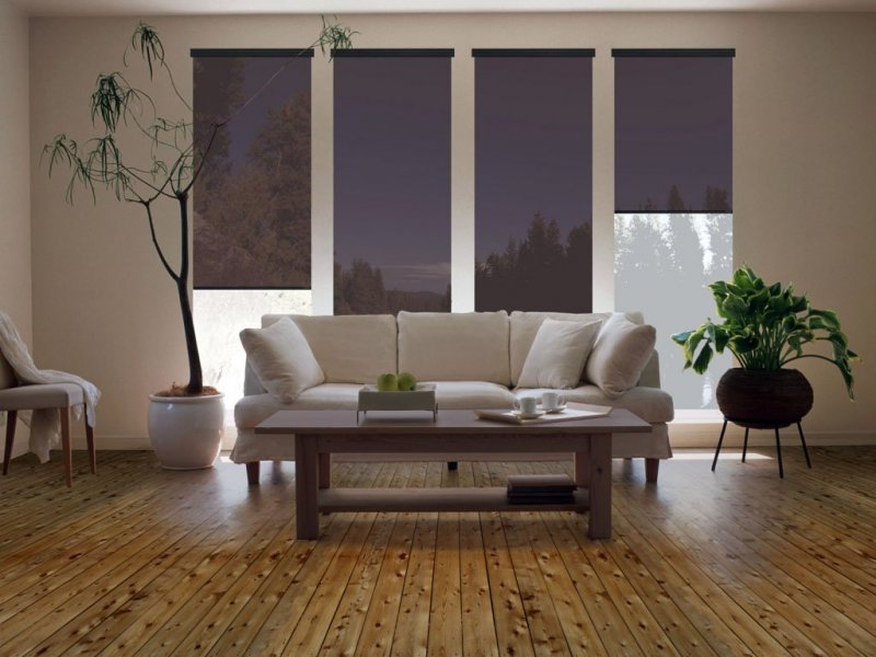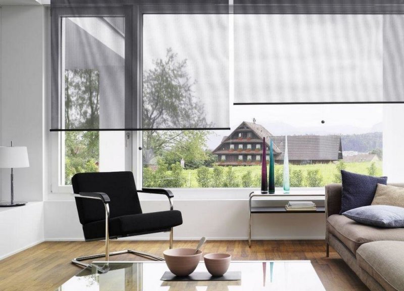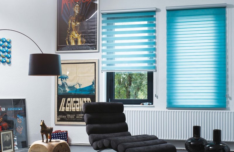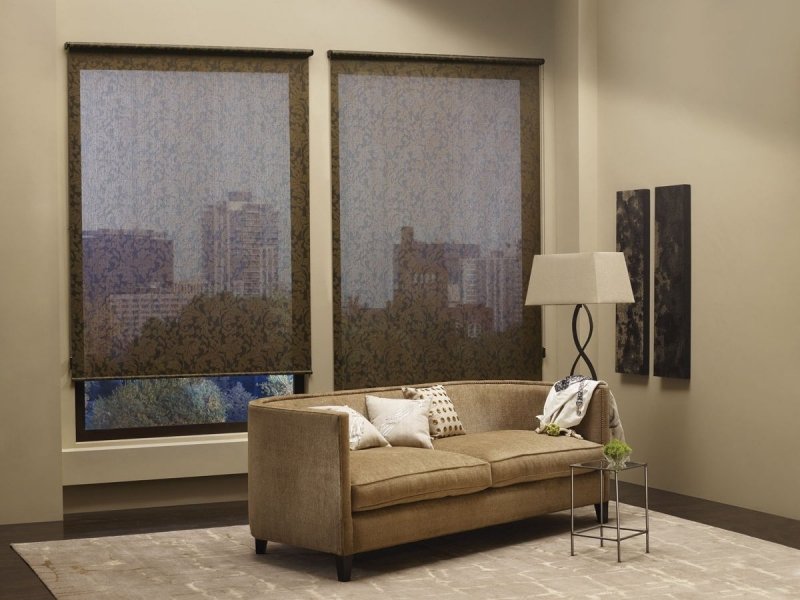 Двойные солнцезащитные конструкции пользуются большим спросом. С их помощью легко добиться необходимого уровня освещенности пространства. Увеличить или уменьшить пропускную способность можно поднятием одного из полотен, что позволит даже днем создать в комнате полумрак. Такой вариант отлично подойдет для небольших по площади помещений, позволит визуально расширить пространство.