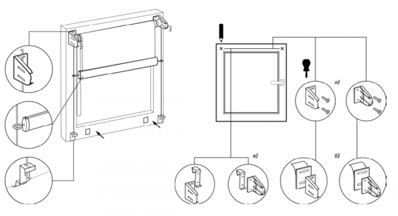 Классические рулонные модели продаются уже в готовом виде, их не нужно собирать. Это облегчает процесс монтажа. Изначально следует приложить рулон к оконному проему и сделать метки, куда будет нанесена двухсторонняя липкая лента и прикреплены пластиковые крючки. Если позволяет тип конструкции, можно применить другой способ крепежа для пластика – использование специальных кронштейнов, которые просто надеваются на верхнюю часть створки.