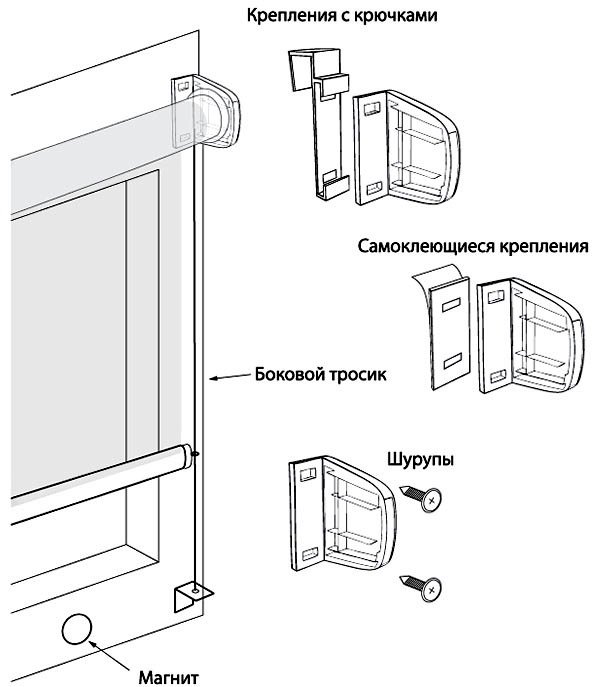Модели с компактным валом подходят как для глухих, так и для открывающихся окон. Устанавливают их на отдельных створках. Монтаж не требует сверления, с ним справится любой человек, без специальных навыков. Для открывающегося вертикально пластикового окна подойдет способ крепления на двухсторонний скотч или накидные кронштейны. Нижнюю планку можно зафиксировать магнитами. Чтобы полотно не отвисало при откидывании створки для проветривания, устанавливают специальный комплект со струнами.
