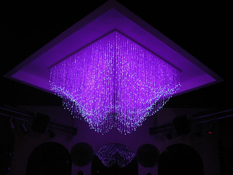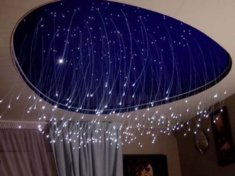 Работа оптоволоконной подсветки осуществляется за счет светового генератора. Поместив нити в натяжную конструкцию, можно добиться изображения любой светящейся картинки с участками разной яркости. Их можно скрыть под материей или вывести наружу.