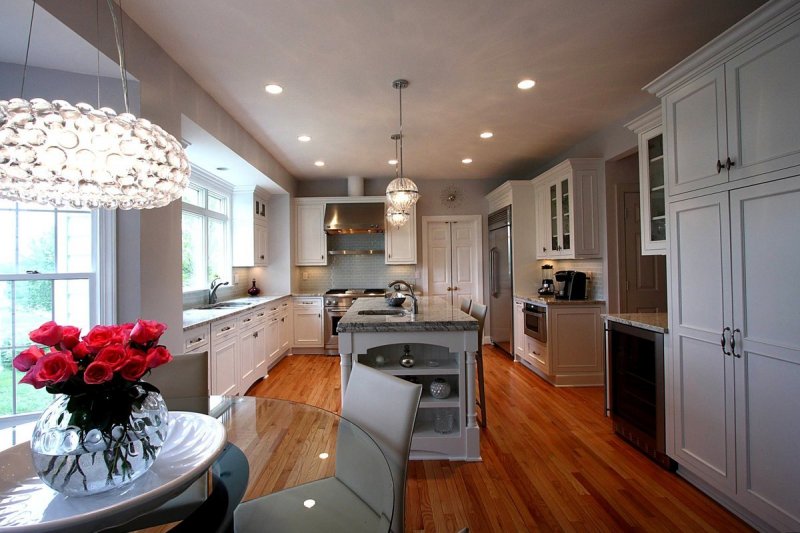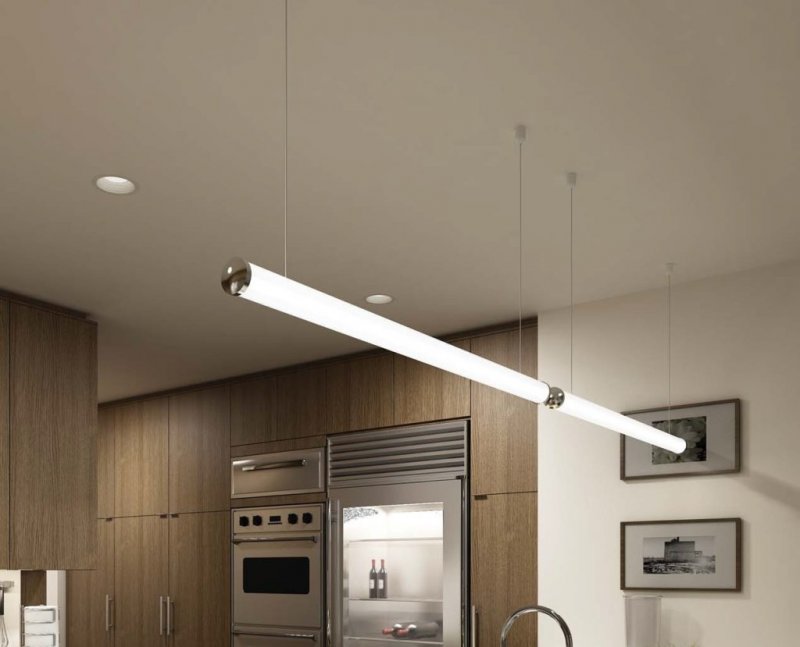 Кухня. Главный источник света следует встраивать над столом. Если их несколько, надо обязательно выдержать между ними правильное расстояние. Над квадратным, прямоугольным предметом мебели лампы лучше выстроить в линию, для овального стола подойдет любое расположение;