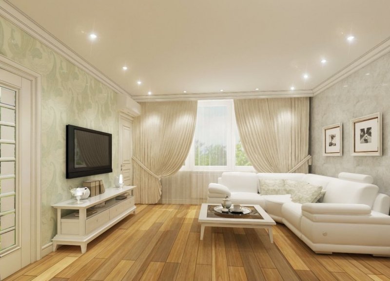Гостиная; Для просторной комнаты подойдет комбинированное освещение. Хорошо будут смотреться большие симметричные лампы, светодиоды по периметру. Будут уместны современные модели с датчиком регулировки яркости;