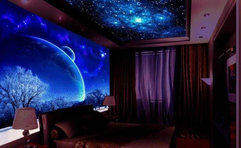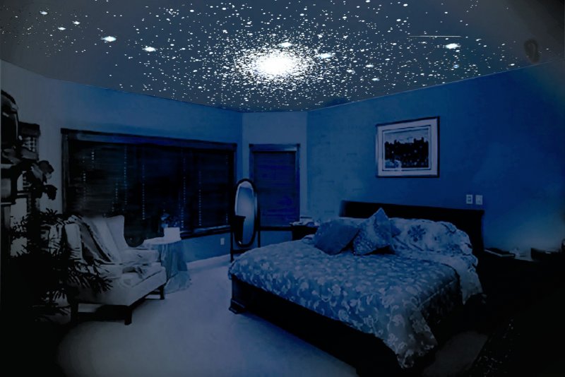 Спальня. Не стоит использовать яркие лампы, большое количество светодиодов на потолке. Красиво будет смотреться «звездное небо» с оптоволоконной подсветкой;
