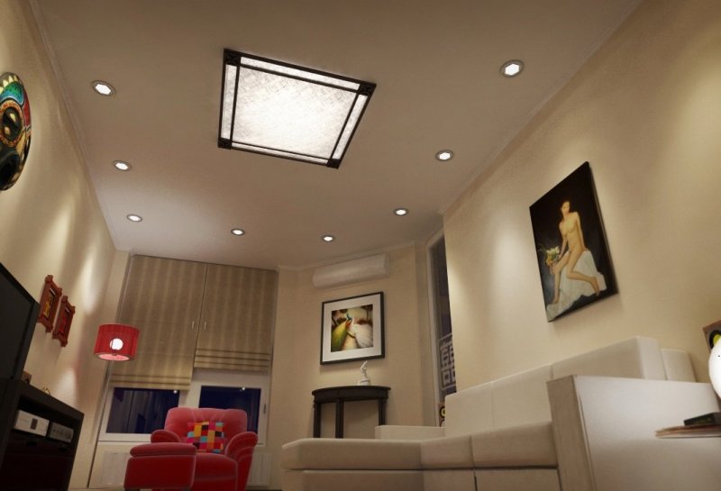В помещениях с низкими потолками не получится установить подвесную люстру, в такой ситуации оптимальным решением станет использование точечных светильников.